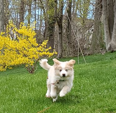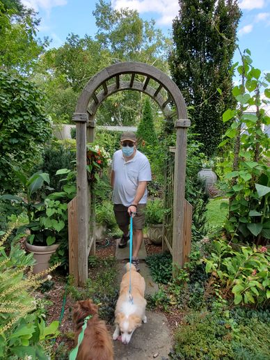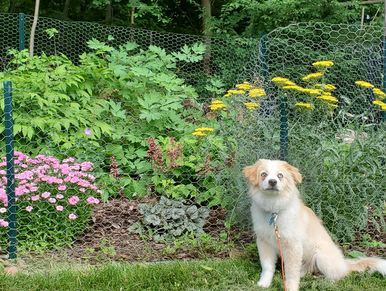 Charlie's first spring exploring Pete's colorful garden.